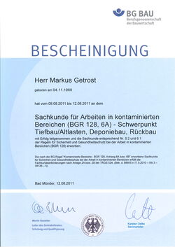 In der Qualifizierung der BG BAU „Sachkunde für Arbeiten in kontaminierten Bereichen (BGR 128, 6A) – Schwerpunkt Tiefbau/Altlasten, Deponiebau, Rückbau“ erwarb Schäfer-III.-Mitarbeiter Dipl.-Ing. Markus Getrost die entsprechenden Kenntnisse zu Sicherheit und Gesundheitsschutz.