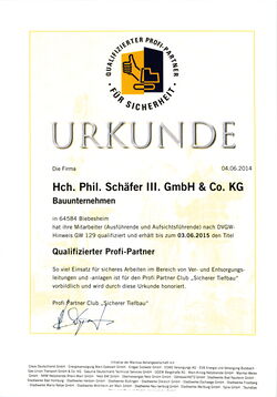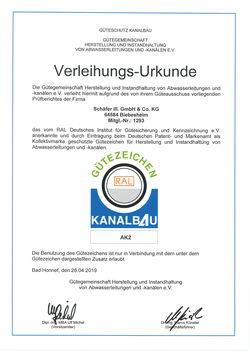 Die Zertifizierung durch die Gütegemeinschaft Herstellung und Instandhaltung von Entwässerungskanälen und -leitungen e.V. bescheinigen Schäfer III. die Qualifikation zur Ausführung von Kanalbauarbeiten aller Art.