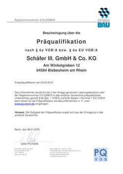 Regelmäßig unterziehen wir uns dem Prüfungskatalog des Präqualifikationssystems für Bauunternehmen zur Vergabe öffentlicher Bauaufträge. Es bestätigt unsere Fachkenntnis, Zuverlässigkeit und Leistungsfähigkeit und erleichtert die Auswahl in öffentlichen Vergabeverfahren.
