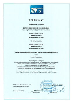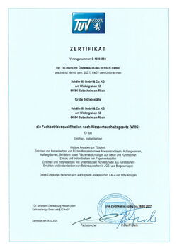 Das TÜV-Zertifikat nach Wasserrecht bescheinigt Schäfer III. die besondere Qualifizierung für den Einbau von unbeschichtetem Beton sowie die Verarbeitung von Beton, Asphalt, Beschichtungssystemen und thermoplastischen Auskleidungen.