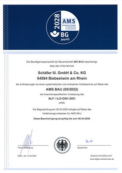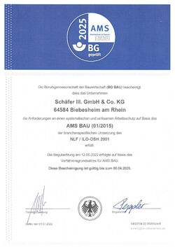 Das Projekt AMS BAU (Arbeitsschutz mit System Bau) der Berufsgenossenschaft der Bauwirtschaft unterstützt kleine und mittlere Unternehmen dabei, eine betriebliche Arbeitsschutzorganisation aufzubauen und zu verbessern. Dies verringert das Unfallrisiko und erhöht Rechtssicherheit, Kompetenz und Professionalität. Kunden und Mitarbeiter von Schäfer III. können sich darauf verlassen, dass wir die Anforderungen an einen systematischen und wirksamen Arbeitsschutz gemäß AMS BAU (09/2005), der branchenspezifischen Umsetzung des NLF/ILO-OSH 2001, erfüllen. Hierfür sind wir zertifiziert.