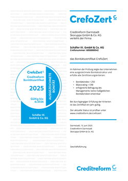 Zum fünften Mal in Folge wurde Schäfer III. vom Marktführer für Wirtschaftsauskünfte, der Creditreform, mit dem CrefoZert für seine ausgezeichnete Bonität zertifiziert. Der dreistufige Zertifizierungsprozess ist an strenge Bedingungen geknüpft. Dazu werden die letzten Jahresabschlüsse, die aktuelle Geschäftslage und unsere Zukunftsperspektiven geprüft und bewertet. Ein Siegel, das für unsere zuverlässigen Geschäftsbeziehungen und höchste sichere Zahlungsfähigkeit steht. Schäfer III. gehört damit zu den zwei Prozent der deutschen Unternehmen, die diese Auszeichnung erhalten haben.
