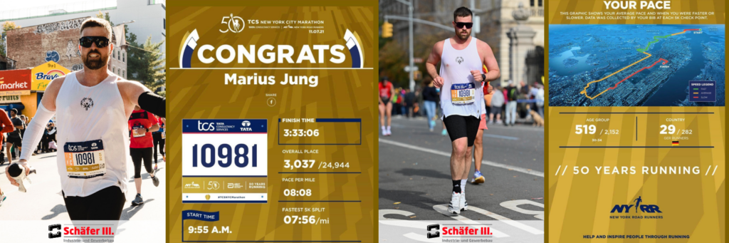 „Der New York City Marathon war mein fünfter Marathon. Dieses Mal habe ich für 5 Monate sehr intensiv trainiert, mit dem Ziel, meine persönliche Bestzeit von 3:42 h zu unterbieten. Das Rennen war extrem anstrengend und ich bin sehr glücklich über mein Ergebnis. Ich bin sehr stolz darüber, dass ich so viel Geld zu einem wunderbaren Zweck sammeln und zudem ein solch grandioses Ergebnis erzielen konnte. Nach einer sehr schwierigen Zeit für die Stadt, war es für New York ein sehr besonderes Erlebnis. Unterstützung von der Heimat und alten Freunden zu bekommen, hat mir zusätzlich sehr viel Kraft gegeben. Ich bedanke mich herzlich bei Schäfer III. für den Support und das Vertrauen“, so Marius Jung.