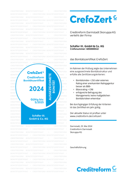 Dafür steht das Bonitätszertifikat CrefoZert der Creditreform. Schäfer III. wurde zum 5. Mal für seine ausgezeichnete Unternehmensbonität zertifiziert. Vielen Dank an die Creditreform für diese Wertschätzung!